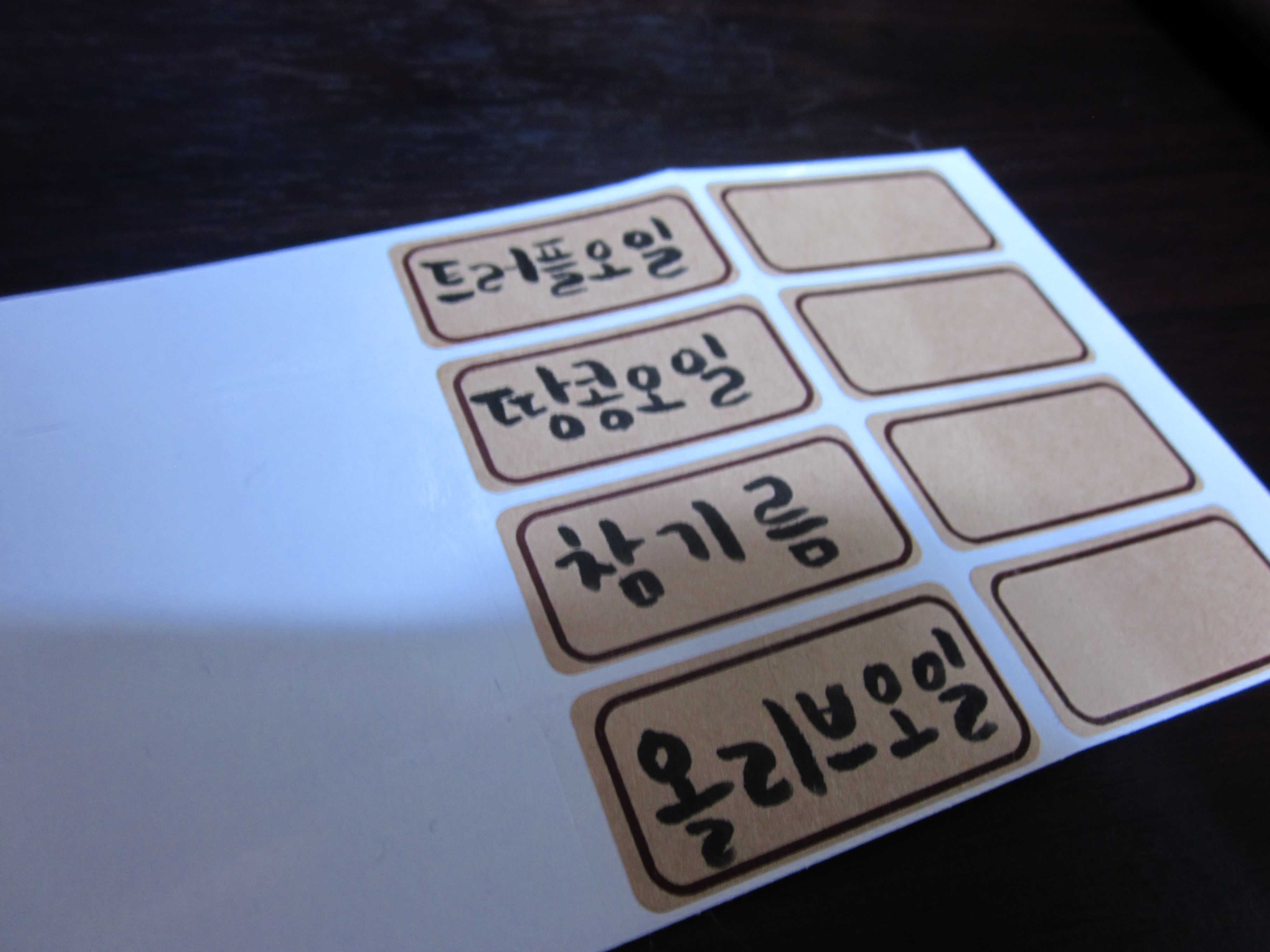그래서 크라프트 견출지를 이용해서 네임택을 붙혀보기로 했죠.