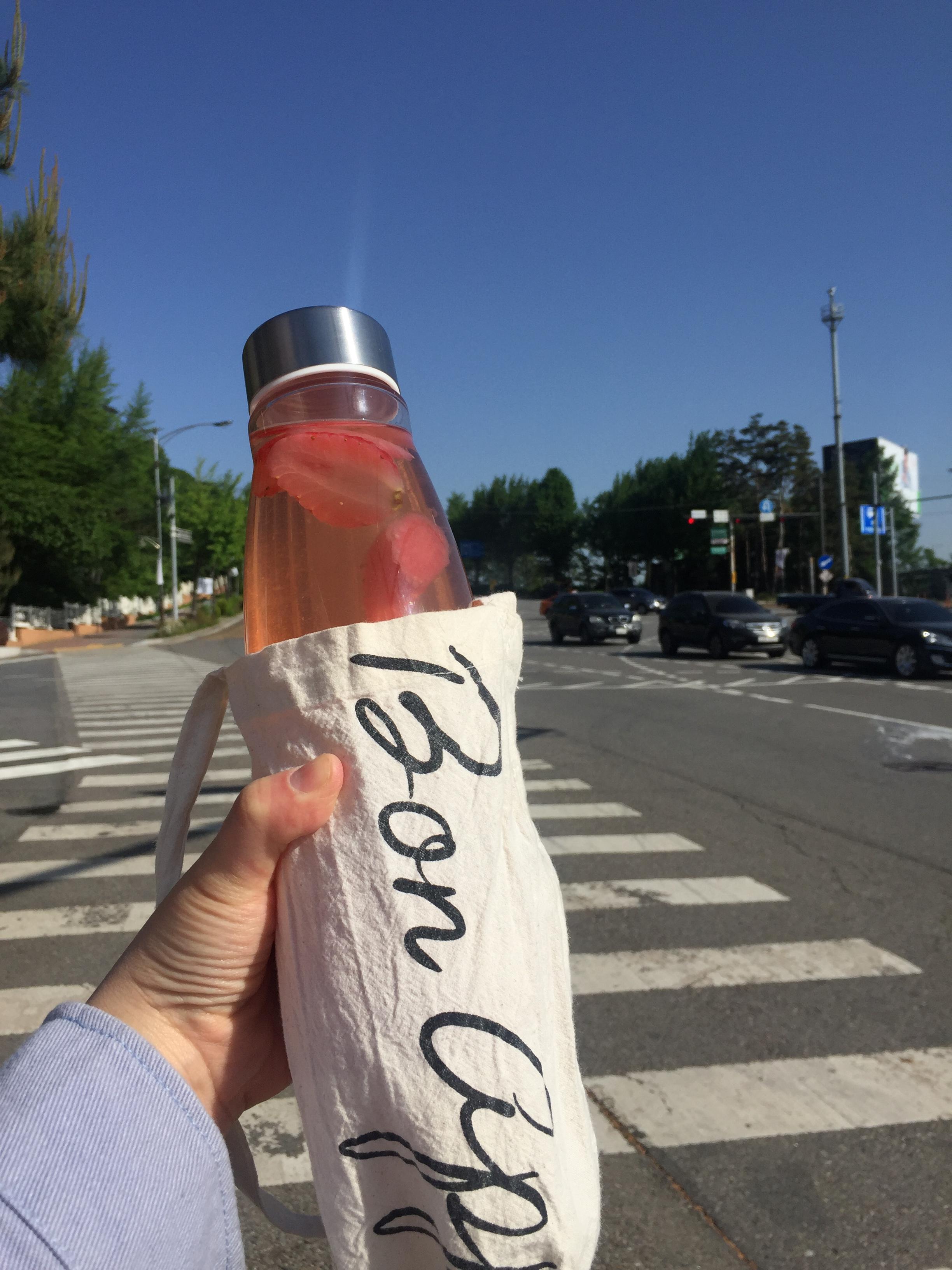 딸기를 썰어넣은 탄산수를 들고 힘차게