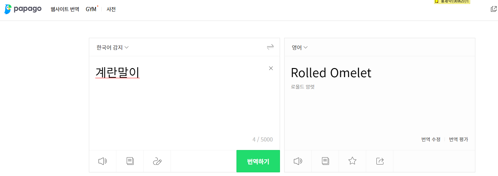 egg roll인가? 그래서 급하게 네이버 파파고 어플을 켜고 계란말이 검색 고고.