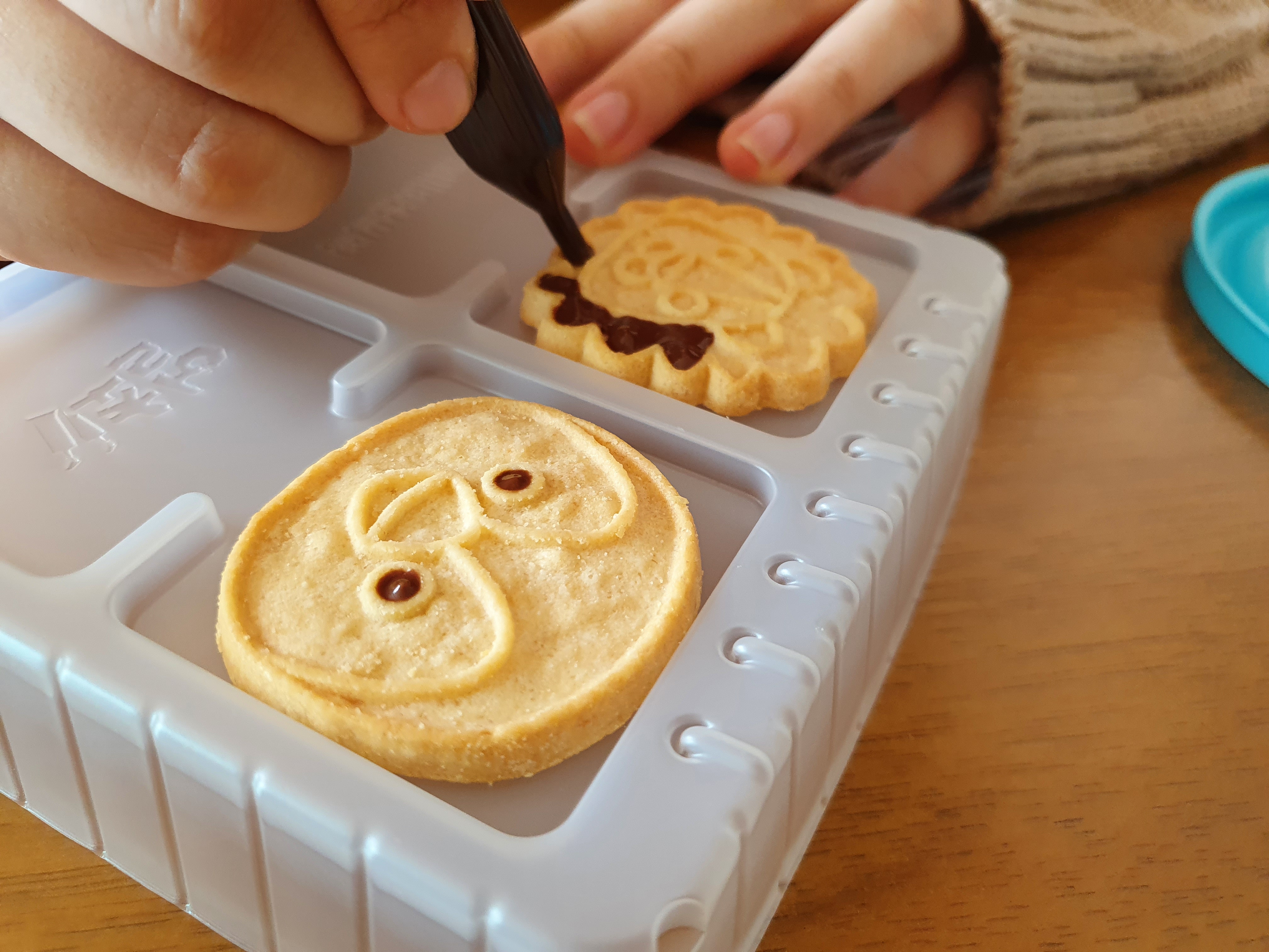 쿠키 위에 초콜릿으로 컬러링을 하는
