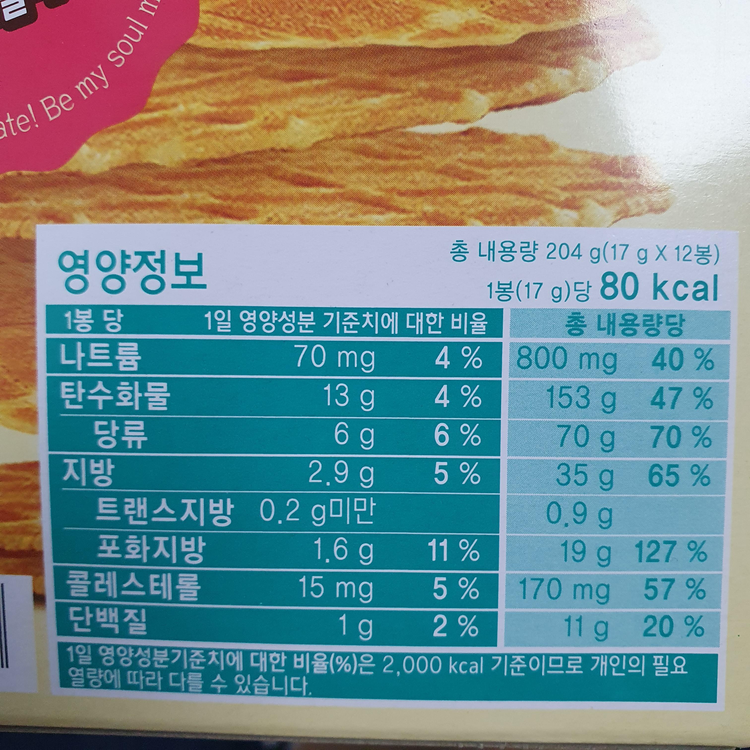 와플과자 1봉지의 영양성분은 80kcal네요.