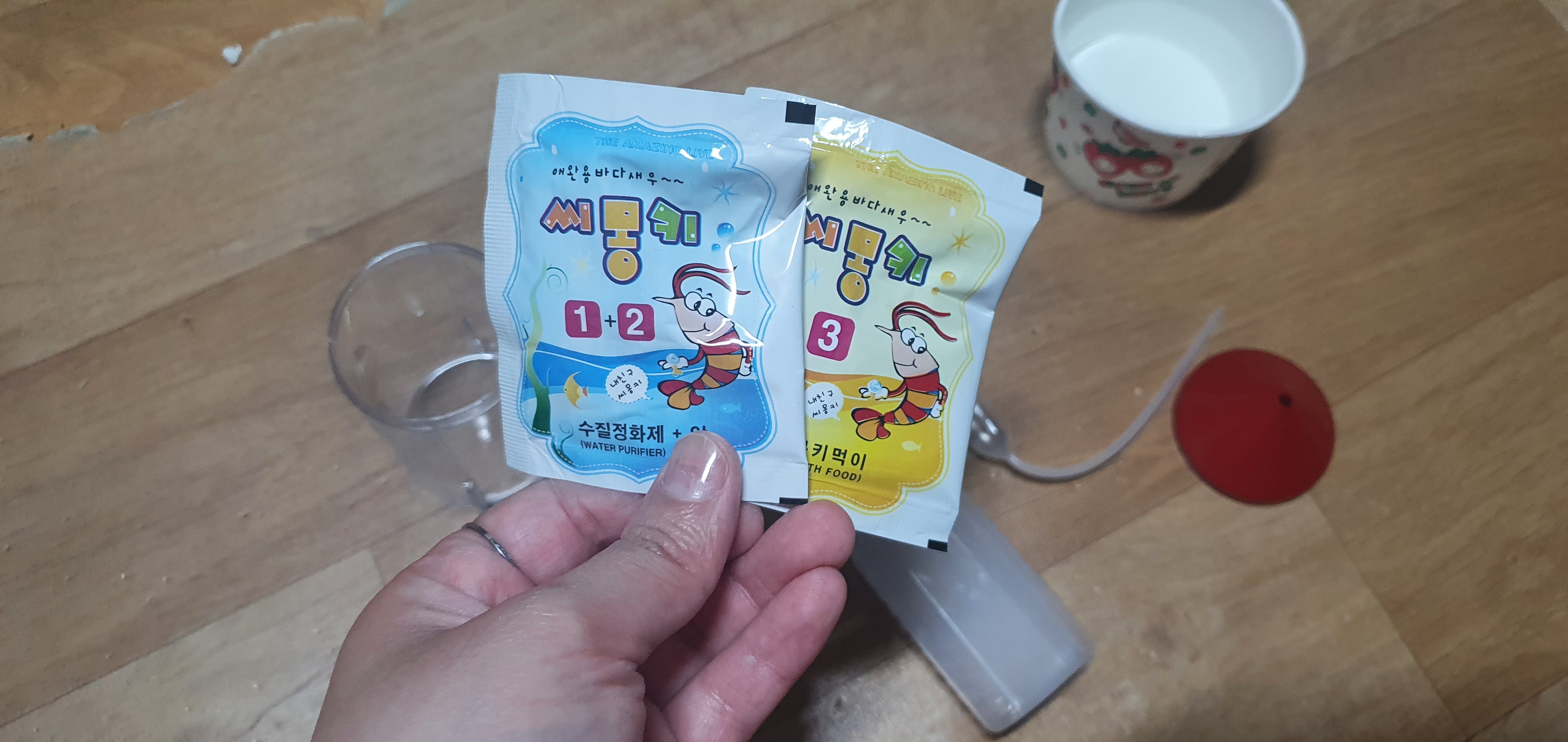 씨몽키를 키울 플라스틱 어항하나 그리고 수질 정화제와 씨몽키 알이 들어있는