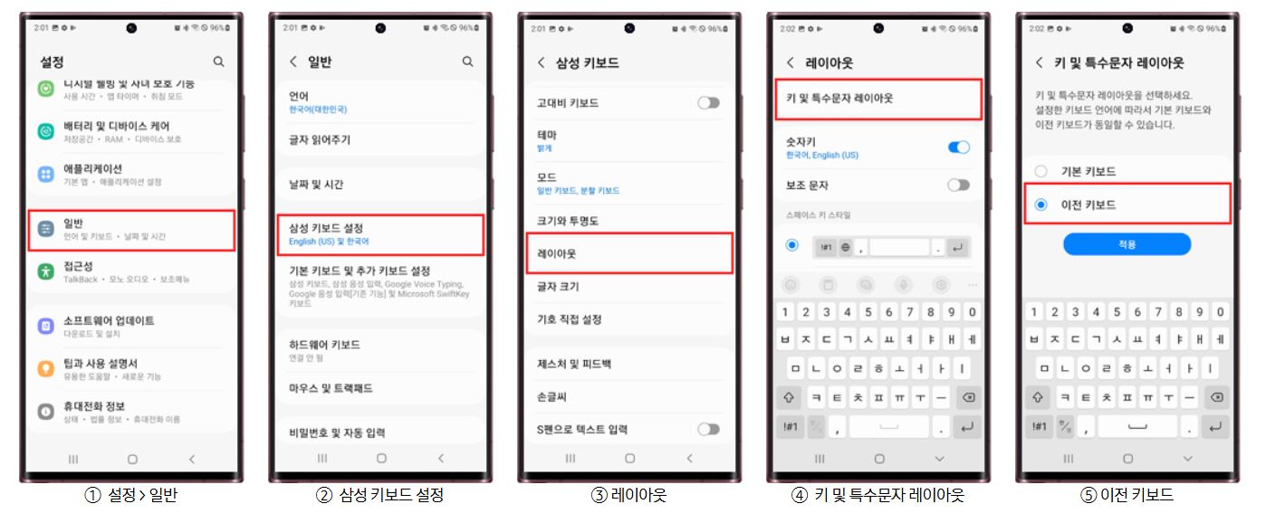 ☞ 설정 → 일반 → 삼성 키보드 설정 → 레이아웃 → 키 및 특수문자 레이아웃 → 이전 키보드 → 적용