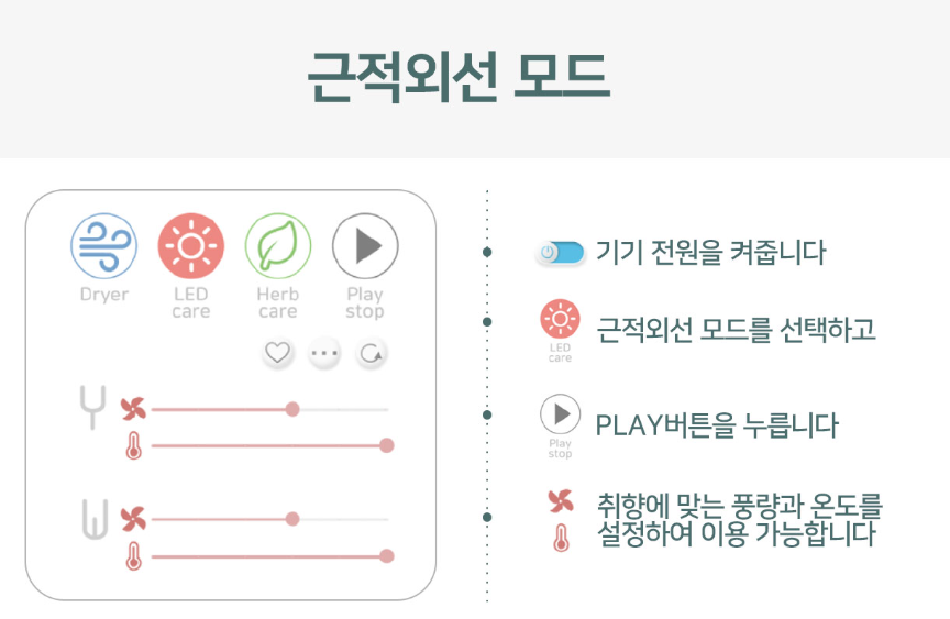 건식 LED 근적외선 좌욕기 모드: 근적외선 LED를 이용해서 건식으로 좌욕기능으로 사용이 가능하여 보다 간편하게 외음부의 좌욕을 할 수 있으며, 바람 기능을 같이 쓰게 될 경우 건조기능을 같이 병행이용 가능