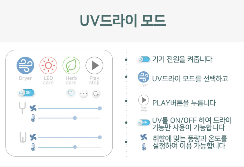 *스팀살균 기능 사용 후에는 UV 드라이모드로 건조 필요
