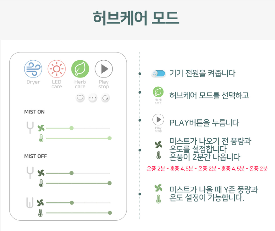 습식 허브 좌훈기 모드: 살균 및 재생에 좋은 천연 허브가 함유된 미스트로 내부의 세균을 억제하여, Y존의 PH를 유지에 도움이 되어 잦은 질염 재발로 고생하시는 분들에게 경우에는 질염 예방에 도움을 줌