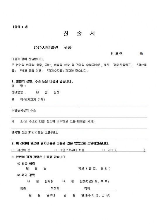 📷 [사진: 개인회생 진술서 양식 표 샘플]